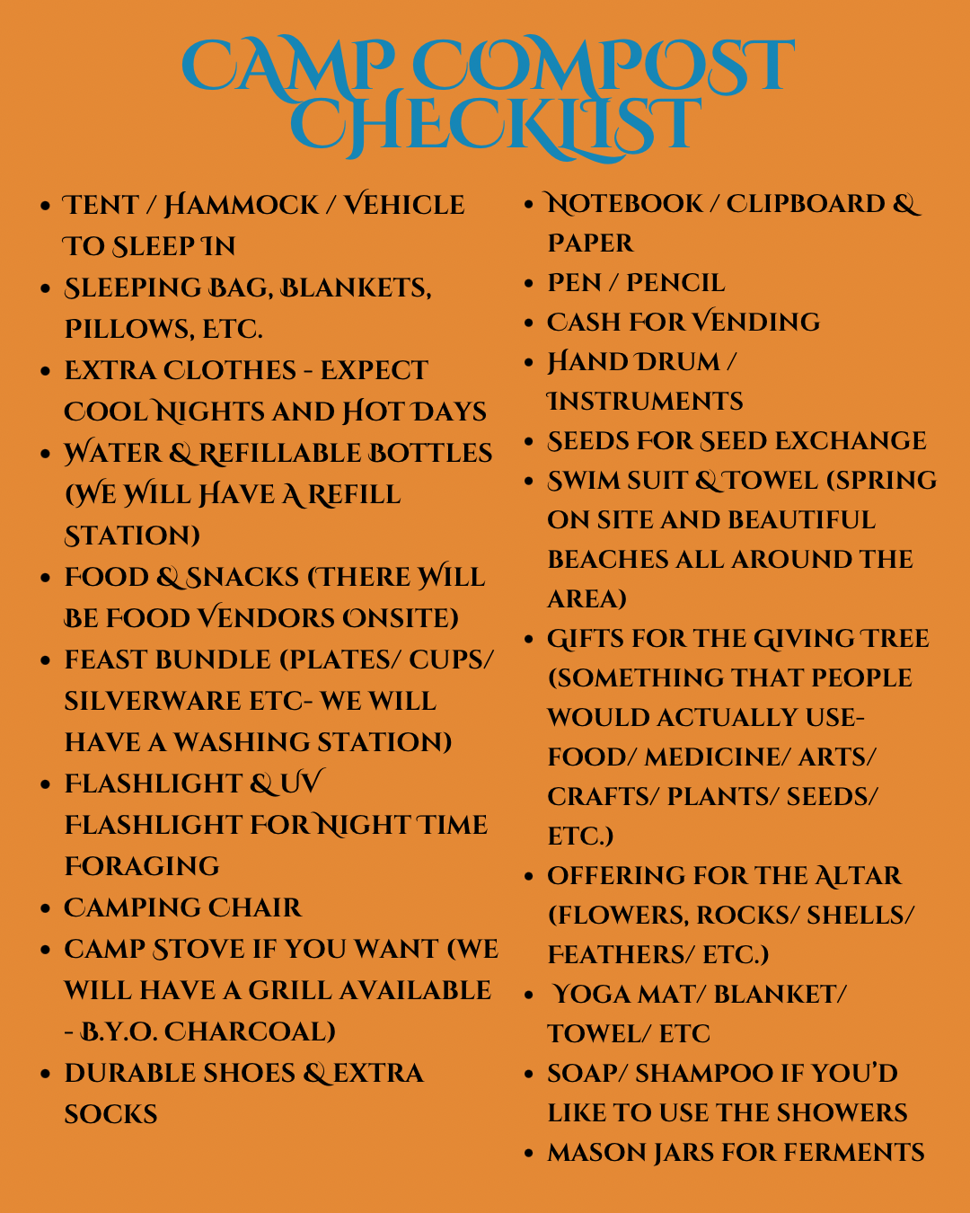 If you have any other questions, feel free to reach out to campcompost@gmail.com before the event or check in with staff at the front gate when you arrive. We can’t wait to welcome you to Camp Compost!